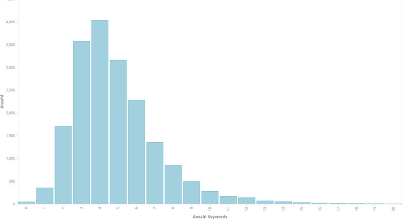 Dieses Histogramm stellt dar, wie viele Artikel mit den jeweiligen Anzahlen an Keywords versehen wurden. Offensichtlich sind für die meisten Artikel 4 Keywords vergeben worden, aber es gibt auch einige wenige Artikel mit mehr als 10 Keywords, sowie ein paar ganz komplett ohne Keywords. Beide Extreme wären nach meinem Verständnis für die Kategorisierung nicht wirklich sinnvoll, aber wie wir sehen, kommt es dennoch vor.