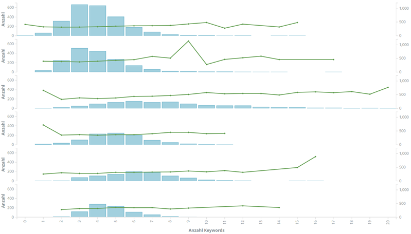 Wir könnten jetzt nachschauen, welcher Autor für z.B. die Null-Keyword-Artikel rausgelassen hat. Aber wir bleiben mal auf der hohen Flughöhe und suchen uns auch für das Keyword-Histogramm eine Überlagerung mit anderen Daten: