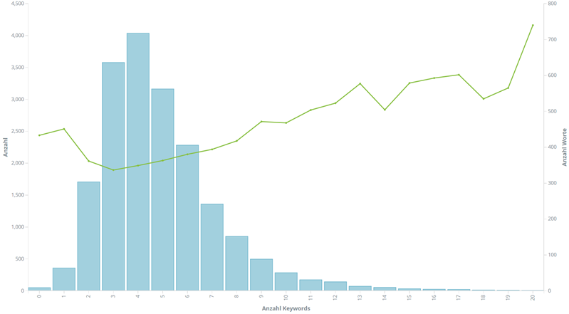 Hier überlagern wir das Keyword-Histogramm mit den jeweils zu den Keyword-Anzahlen gehörenden Wort-Mengen. Ganz offensichtlich haben längere Artikel im Durchschnitt auch mehr Keywords was durchaus einer gewissen Logik entspricht, wenn ein Thema breiter betrachtet wird oder z.B. die "Was war, was wird"-Artikel schlicht die Top-Themen einer ganzen Woche diskutieren.