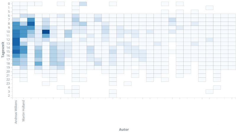 Hier sind nun auf der x-Achse eine Reihe von Redakteuren aufgetragen, während auf der y-Achse -- wie hier schon gewohnt -- die Uhrzeit aufgetragen ist. Je tiefer das blau in einem Feld, desto mehr Artikel hat ein Redakteur zu dieser Zeit veröffentlicht. Die beiden Top-Scorer lassen sich in dieser Grafik nicht verleugnen; die Zuordnung der weiteren Redakteure lasse ich ein wenig im Nebel. Deutlich wird aber auch so: auf den Plätzen 3 bis 7 gibt eine kleine Arbeitsteilung zwischen Früh- und Spätschicht; das sieht ein wenig nach Halbtags-Tätigkeit aus. Und auch in dieser Grafik ist ganz grob erkennbar, dass um 12:00 für die meisten Mittagspause ist.