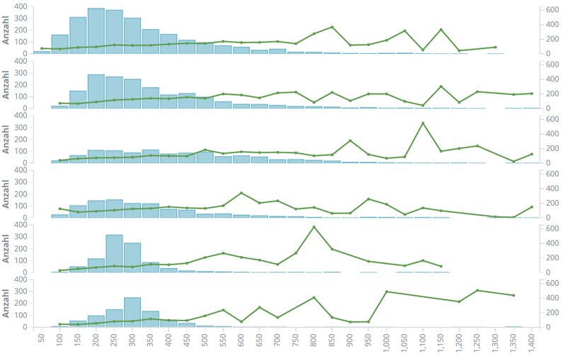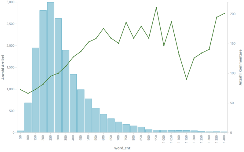 Der Mittelwert über alle Artikel liegt bei 373 Worten, der Median bei 314. Die meisten Artikel gibt es im Bereich zwischen 200 und 250 Worten; allein der Bereich 150-300 Worte summiert bereits 45% aller Artikel auf sich. Diese Verteilung ansich ist nicht unbedingt überraschend; entscheidende Informationen lassen sich hieraus zunächst nicht ableiten. Interessant wird es aber, wenn wir dieses Histogramm durch Überlagerung mit anderen Werten korrelieren. Als einen Vorgriff auf die detaillierte Analyse der User-Kommentare überlagern wir hier die durchschnittliche Anzahl an Kommentaren als grüne Linie:
