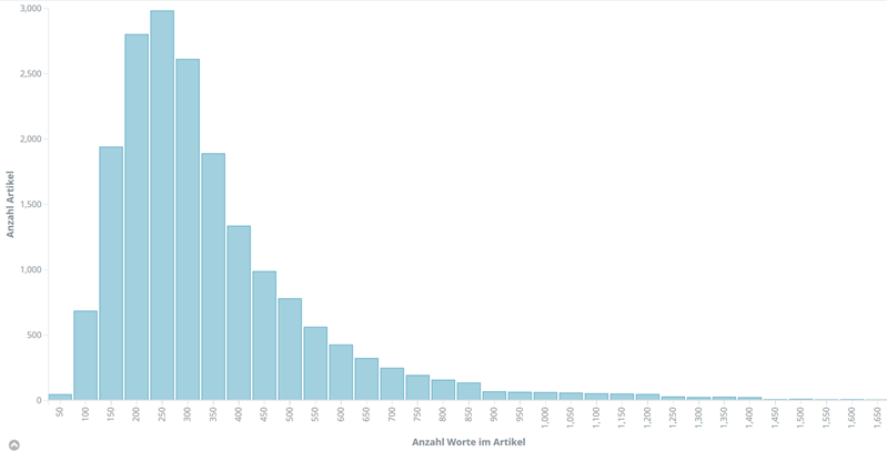 Als ein erstes Feature von Artikeln soll an dieser Stelle deren Länge herhalten. Als Maßeinheit kommen verschiedene Eigenschaften des Textes in Betracht. Für meine Auswertung habe ich mich für die Anzahl der Worte im sichtbaren Bereich des Artikels entschieden: