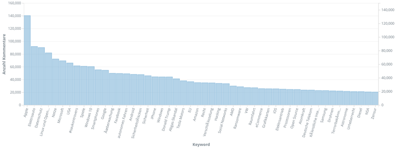 Auf der x-Achse sind die 50 meistverwendeten Keywords in absteigenden Reihenfolge der Häufigkeit ihrer Verwendung aufgetragen; auf der y-Achse die Anzahl an User-Kommentare, die auf Artikel mit dem jeweiligen Keyword abgegeben wurden. "Apple" sticht hier genauso hervor und auch für die anderen Keywords kann man erahnen, dass die Anzahl der Kommentare pro Keyword gut mit der Anzahl der Artikel pro Keyword korreliert.