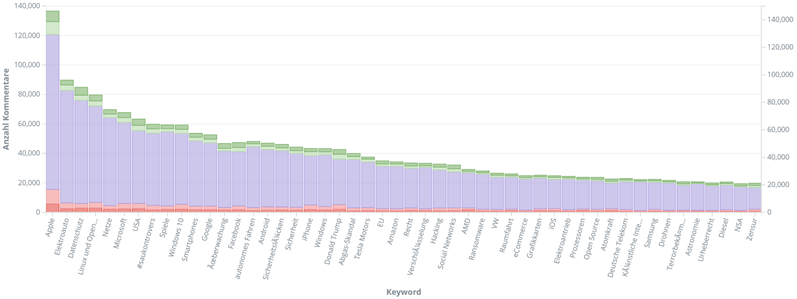 Diese Grafik wird ins im nächsten Teil bei der näheren Betrachtung der User wieder begegnen. Für jetzt wollen wir noch einen Blick auf die Verteilung der positiven und negativen Kommentare je Keyword werfen: