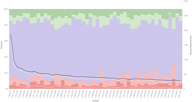 Hier sind nun die 50 meistkommentierten Artikel mit dem Keyword "Donald Trump" (jeweils mit ihrer Artikel-ID) aufgetragen , wieder mit auf 100% normierten Balken und Aufteilung der Bewertungen. Zumindest bei diesem Keyword ist keine grüne Welle erkennbar, jedoch scheinen manche Artikel deutlich heißer diskutiert zu werden als andere: Das Verhältnis zwischen positiv, negativ und neutral bewerteten Artikeln variiert deutlich und macht Lust, die Hintergründe hierfür zu erforschen.