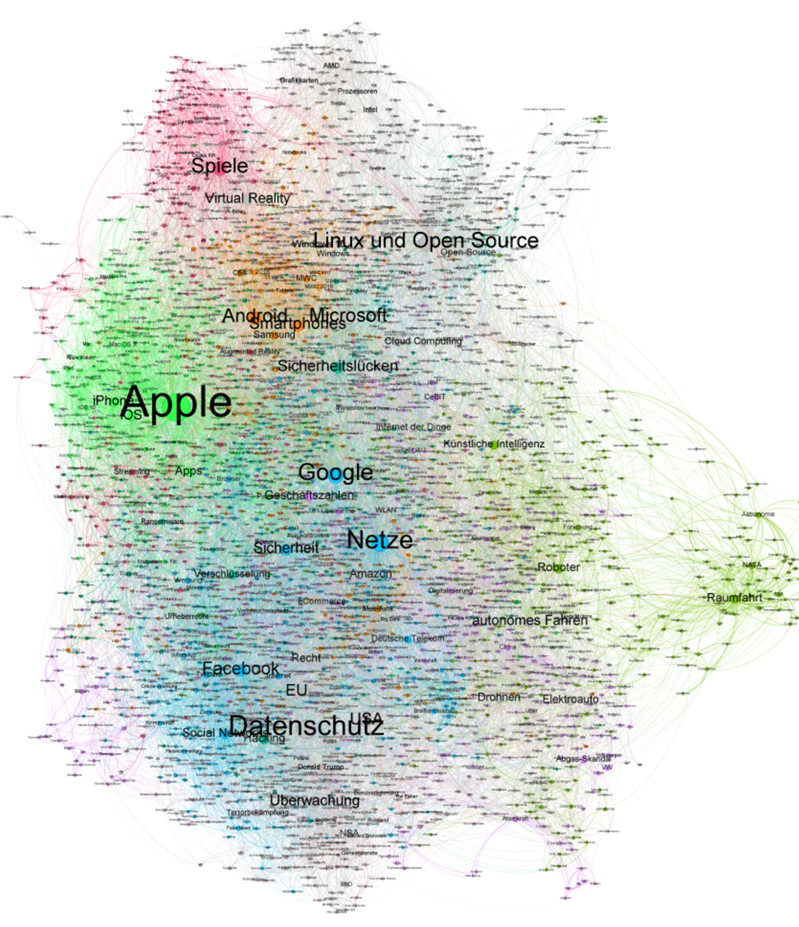 Lustigerweise ist ein Bild entstanden, dass irgendwie an die Umrisse einer Deutschlandkarte erinnert. In diesem Bild ist der Ruhrpott dann durch Apple dominiert. Der Norden spielt und kümmert sich um Prozesoren und der Süden ist dem dem Datenschutz beschäftigt, während der Osten außer mit der Raumfahrt eher dünn besiedelt ist mit Themen. Microsoft sitzt in Hannover und Linux in Berlin.