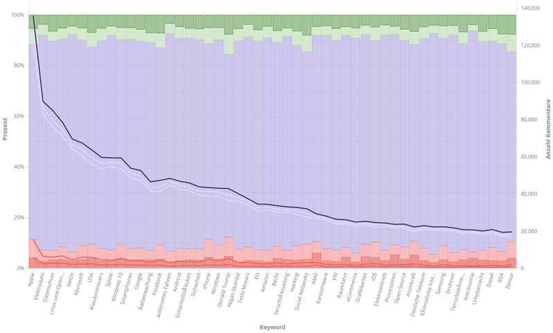 Auch in dieser Grafik sind auf der y-Achse die 50 meistverwendeten Keywords in absteigenden Reihenfolge aufgetragen. Auf der y-Achse sind nun die Kommentar-Anzahlen auf jeweils 100% je Keyword normiert, so dass die Anteile der positiven und negativen Bewertungen verglichen werden können. Die überlagerte Kurve stellt zum Vergleich nochmal die Anzahl der Kommentare dar, die für Artikel mit dem jeweiligen Keyword abgegeben wurden.