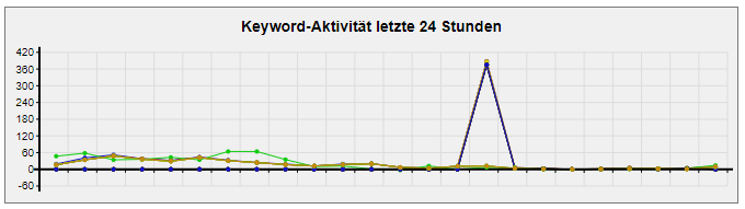 Die Darstellung startet mit der Übersicht der Kommentare pro Keyword, gewichtet nach ihren Häufigkeiten der letzten 24h. Die Linien haben ein Mouse-Over und zeigen dann das zugehörige Keyword. Insgesamt werden die 15 meistverwendeten Keywords visualisiert und in der Legende -- die als Mouse-Over verschwindet -- den Farben zugeordnet.