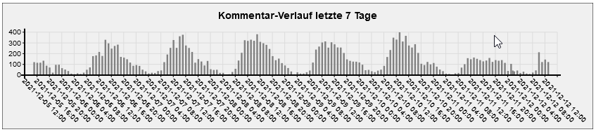 Als Anhaltspunkt für die Gesamtaktivität in den Foren werden im zweiten Chart die pro Stunde eintreffenden Kommentare über alle Artikel-Foren hinweg dargestellt. Diese Grafik kann ganz hilfreich sein, die Aktivität in einzelnen, konkreten Foren besser einzuordnen.