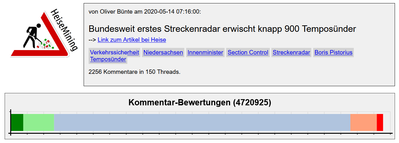 Nach Autor, Datum und Titel des Artikels folgt ein Link direkt nach heise.de sowie die Liste der für diesen Artikel vergebenen Keywords. Diese Links führen direkt wieder zur Keyword-Statistik, mit eben dem gewählten Keywords. Die weiteren dargestellten Werte sind Agregationen aus dem gesammelten Datenstamm und liefern ein erstes Bild vom Artikel.